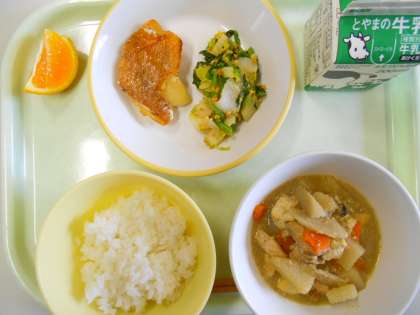 今日の献立は、ご飯、赤魚の塩焼き、炒り大豆和え、根菜のごま煮、清見オレンジ、牛乳 です。