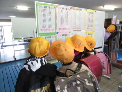 進級おめでとうございます。3年生はクラス替えがあり、児童玄関では、自分や友達が何組なのかじっくりと確かめていました。これから始まる新学期に、わくわくしている様子でした。