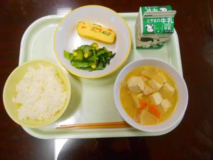 今日の給食は、ごはん、牛乳、千種焼き、コーン和え、鶏肉と大根のごますき煮です。