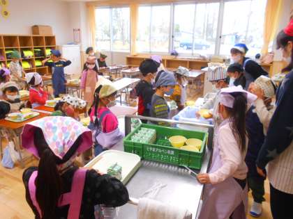 1年生の給食が始まりました。みんなで協力しながら準備を上手にしています。