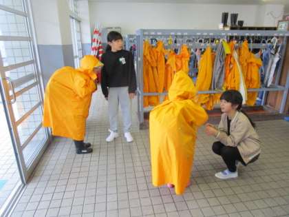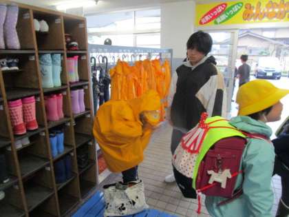 今日は朝から雨の1日でした。玄関では、カッパを脱いだり、掛けたりする手伝いをしました。また教室では、朝の準備の仕方を教えています。