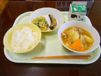 今日の給食は、ごはん、牛乳、いわしの梅煮、いり大豆和え、肉じゃがです。いわしの梅煮は、骨が柔らかくなるまで煮込んであるので、骨ごと食べることができます。