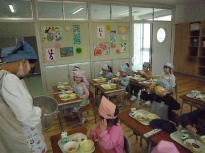 9日より給食が始まりました。エプロンを身に付け、手洗いをし、順番に配膳します。給食当番が一生懸命よそってくれました。おいしく食べて午後の活動もがんばることができました。