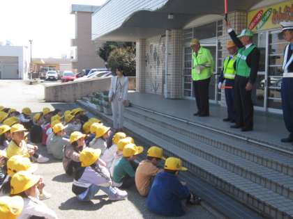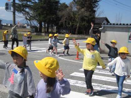 実際に小学校の近くの横断歩道の歩き方を教えていただきました。自分の目で右左を確認すること、手を挙げて渡ることができました。毎日の登下校も安全にできるようにしていきましょう。