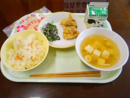 今日の給食は、入学・進級おめでとう給食です。ちらし寿司、牛乳、鶏肉の唐揚げ、よごし、すまし汁、お祝いデザート(クレープ)です。