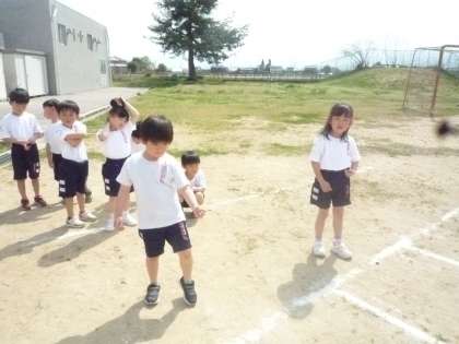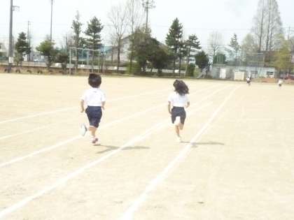外で初めての体育を行いました。青空の下、一生懸命走りました。スタート前は少しどきどきしているようでした。