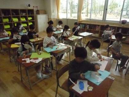 図工で自分の好きなものの絵をカードにかきました。今日は色画用紙に貼って作品を仕上げました。学習参観で掲示しますので、ぜひご覧ください。