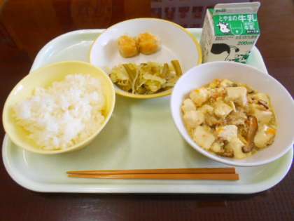 今日の給食は、ごはん、牛乳、にんじんのシューマイ、茎わかめのチョナムル、マーボー豆腐です。にんじんのシューマイは、ほんのりオレンジ色をしていますが、にんじんが苦手な人でもおいしく食べることができます。