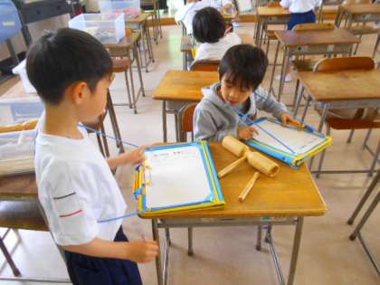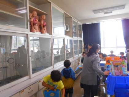 1年生が学校探検をしていました。理科室の人体模型や音楽室のいろいろな楽器に興味津々の様子でした。