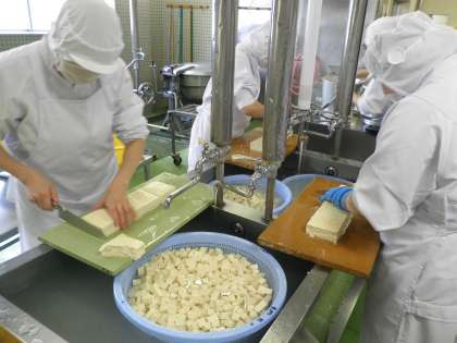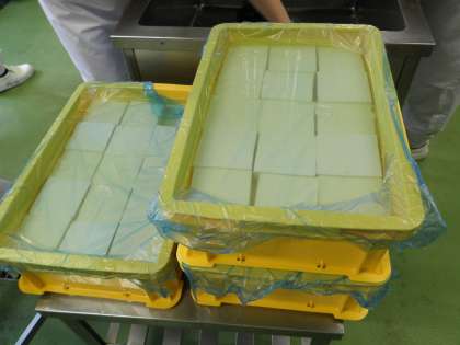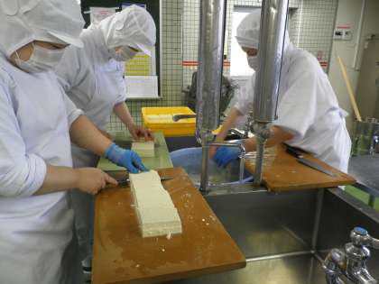4月から給食の調理が民間委託となりました。とても丁寧に調理していただいています。今日のメニューのマーボー豆腐のために調理した木綿豆腐は127丁、38キログラムだそうです。同じ大きさになるように、くずれないように、やさしく切っているそうです。