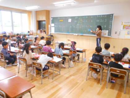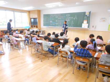 1年生もしっかり学習しています。5になるのは、いくつといくつか、おはじきを使って一生懸命考えていました。