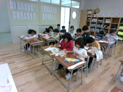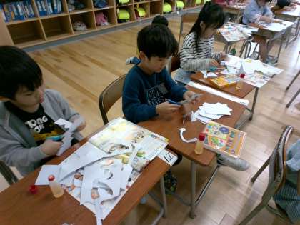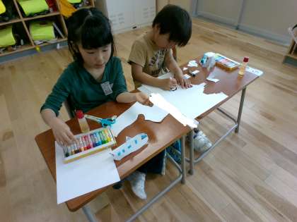 紙を折って立ててみると何に見えるかな?と想像を膨らませてみました。「ロケットみたい」「外側は家で、内側は家の中にしたよ」といろいろなことを思いつきながら楽しく制作しました。