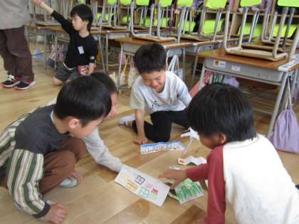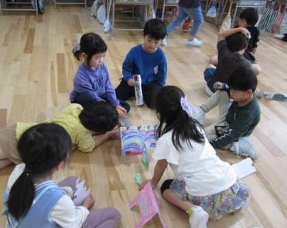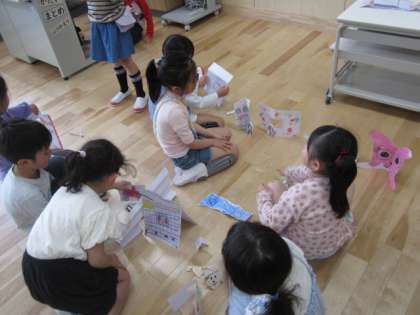 1年生:「図工:おって、たてたら」:4月25日(木) 公開日 2024/04/25 更新日 2024/04/25 1年生の部屋 今日の図工は、作った作品をみんなで見せ合いました。作品を床いっぱいに広げると、建物や電車、動物等、大きな一つの街のようになりました。 「これは何?電車がトンネルを走っているね」「私の作ったうさぎ、友達が作った家のペットみたいに見える!」などと、楽しそうに活動していました。