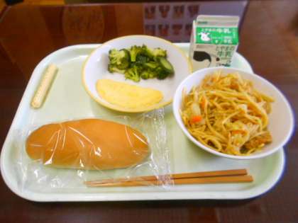 今日の給食は、コッペパン、牛乳、オムレツ、ドレッシングサラダ、焼きそば、棒チーズです。