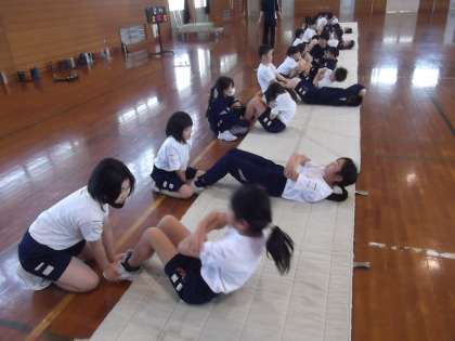 グラウンドが使えない日は、体育館でシャトルランや上体起こし、反復横跳び等、体力テストに向けた練習を行っています。