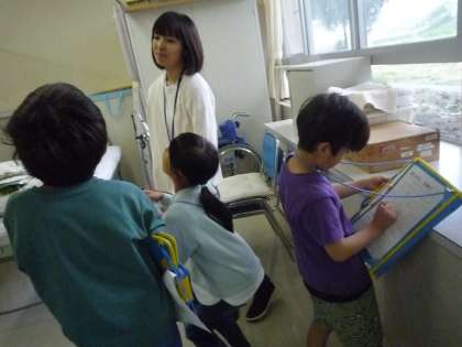 今日は学校探検パート2として、校長室、職員室、保健室、用務員室へ行きました。教室との違いを見つけたり、数を数えたりして何があるのか調べることができました。また、聞きたいことを先生に質問しました。普段入ることがない特別教室に興味津々でした。
