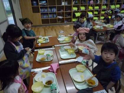 今日の給食は「こいのぼりハンバーグ」「かしわもち」が出ました。配膳するときから「かわいい〜」「おいしそう!」と,、わくわくしていました。ハンバーグとこふきいもを見て「いもが雲みたいで、こいのぼりが泳いでいるみたい」と、すてきな感想を話していました。おいしくいただきました。