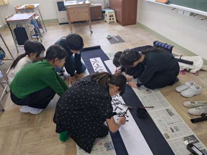 今年度の児童会スローガンを掲示しようと、筆で書いているところです。