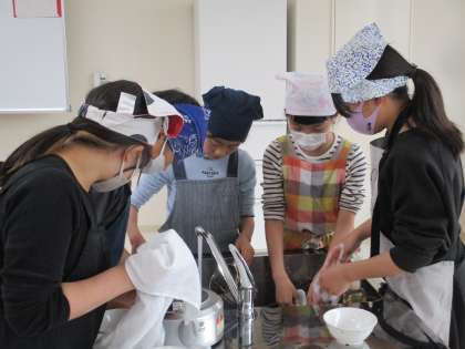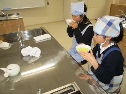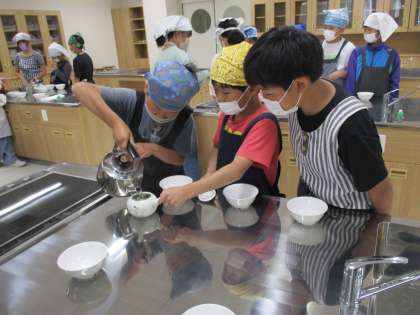 家庭科の調理実習で、「お茶」を入れました。温度に気を付けて水の量を量り、手順に沿ってそそぎました。丁寧に入れたお茶はいつもより美味しく感じたようです。片付けまで協力して行っていました。