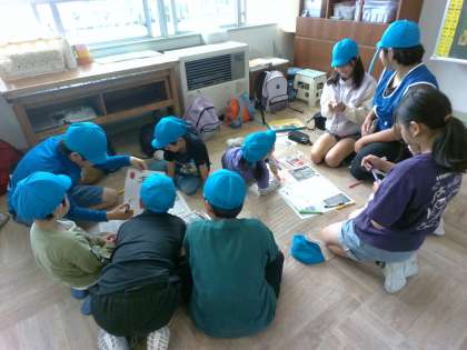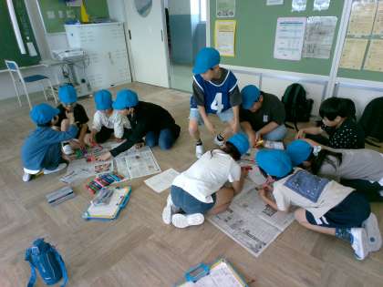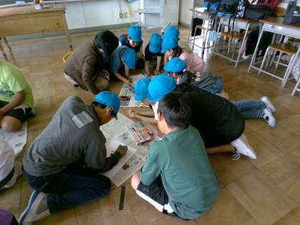 班ごとの活動が始まりました。班カード作りでは、自然と顔を寄せ合って「何書く?」「ペン使う?」と自然と会話が生まれています。