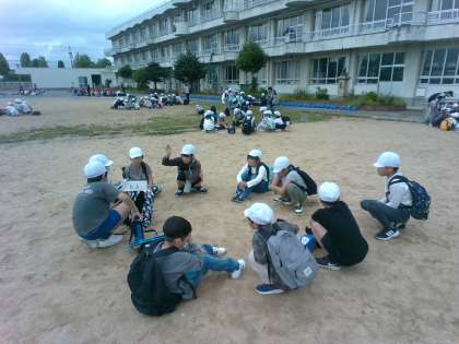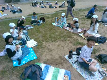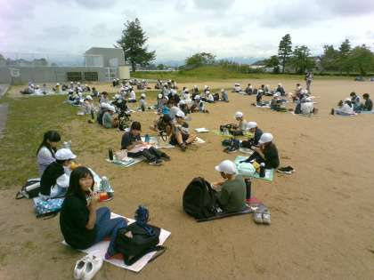 天候が回復したので、グラウンドで弁当を食べました。班の仲間と美味しくいただきました。