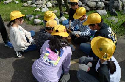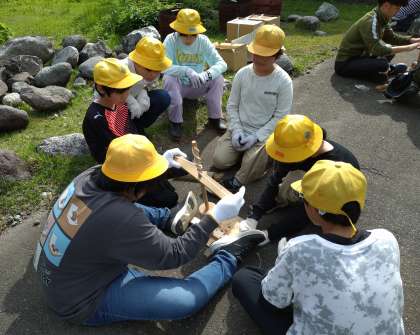 午後からの活動は、野外炊飯です。まずは火起こしから!火がつきそうでなかなかつかず…最後まで諦めずに頑張りました。