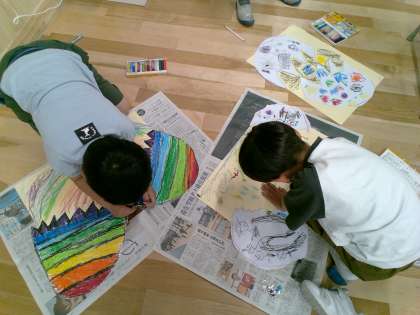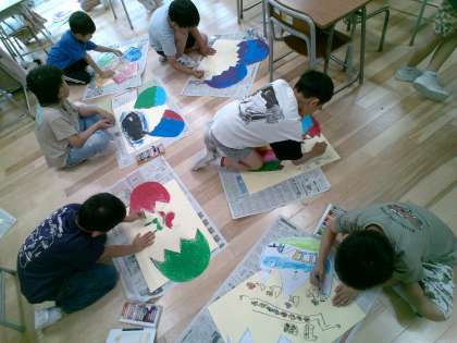 大切につくったたまごがいよいよ割れて、中から様々なものが飛び出してきました。たまごからうまれた世界について、自分の思いを友だちに伝えたり、友達に尋ねたりしながら、作品を仕上げています。