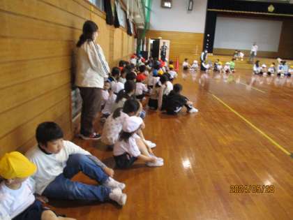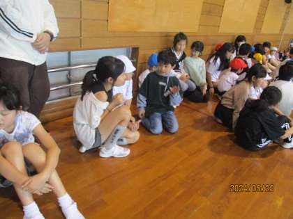 1年生の初めてのシャトルランに5年生はお手伝いに行きました。ペアの子の回数を数えたり、回数を重ねるためのコツを教えたりしていました。1年生と優しく関わり合う姿が見られました。