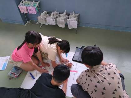 理科では、人の体のしくみについて学習しています。人体模型や資料から、体の中にはどんな臓器があるのか、グループでまとめています。