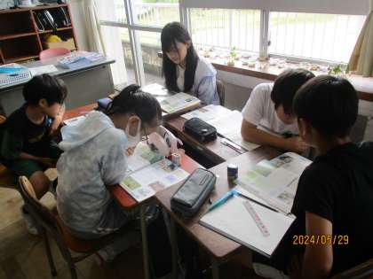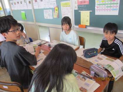 社会科の学習で、低い土地に住む人々の暮らしを学んでいます。今日は、低い土地に住む人々の工夫を教科書を基に考えました。本文や資料の中から、工夫を見つけて班の人と交流しながらノートにまとめました。