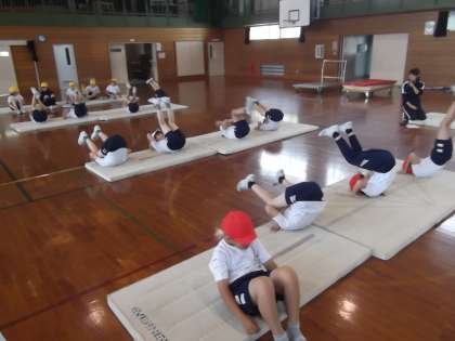 マット運動の学習では毎時間、各団2枚マットを準備して、ゆりかご等の体ほぐしから始めています。