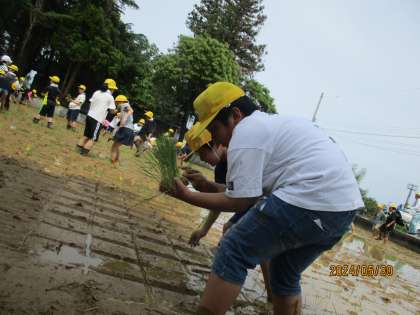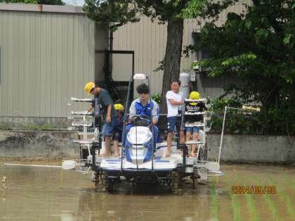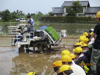 田植えの後に、実際に機械で苗を植える様子も見学させていただきました。時間と労力をかけて行った田植え作業が、機械だとあっという間に終わり子どもたちは驚きをかくせないようでした。更に子どもたちは、機械にも乗せていただき貴重な体験をすることができました。