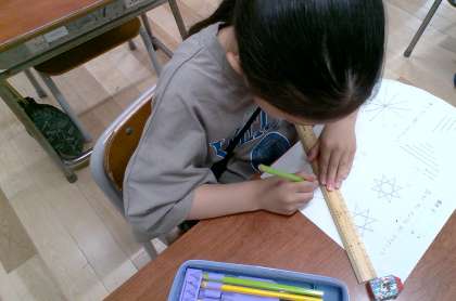 算数科の学習では、長さについて学習しています。今日は、竹ものさしを使って直線をひく練習をしました。ものさしをしっかり押さえて、ずれないように気をつけて練習しています。