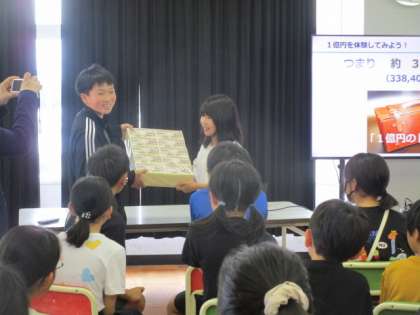 今日は富山財務事務所の方に来ていただき、税金や財政のことについて教えていただきました。子どもたちは、自分が学校に通うのに、6年間で3億円以上のお金が使われていることを知りました。最後に一億円のレプリカをもち、一億円の重みを感じました。