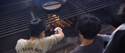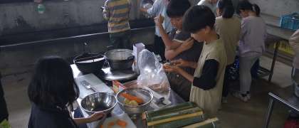 火起こし、米とぎ、野菜切り…みんなで協力して、カレーライスを作っています。