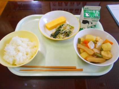 今日の給食は、ごはん、牛乳、厚焼き卵、小松菜のごま和え、関東だきです。