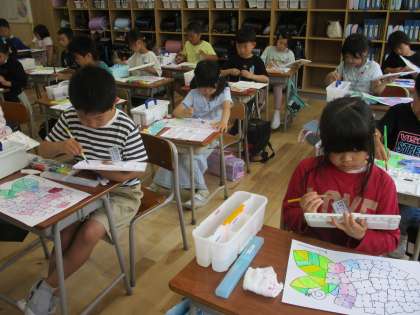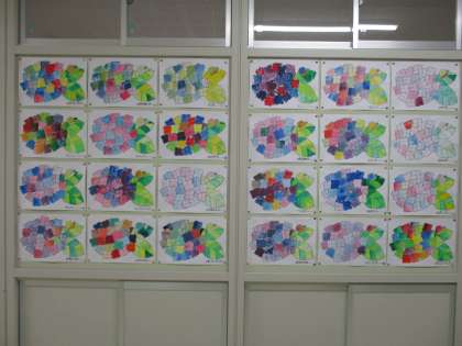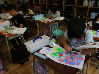 2年生:水彩指導:6月6日(木) 公開日 2024/06/07 更新日 2024/06/07 2年生の部屋 水彩を使って、6月にぴったり、アジサイの花に色を塗りました。 絵の具を混ぜて、紫やピンク、水色をつくり、きれいな色ができたと満足そうな子供たち。はみ出さないようにと真剣に集中して取り組む姿がたくさん見られました。 教室の廊下は、すてきなアジサイの花ででいっぱいです。