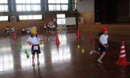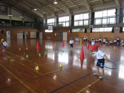 今日の体育は、くねくね走に挑戦!くねくね走り、ミニコーンジャンプに加え、フラフープ回しも取り入れ、色団で話し合いながら、コースを作りました。他の団の考えたコースにも挑戦し、楽しんで取り組んでいました。