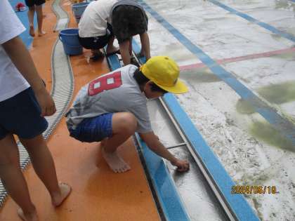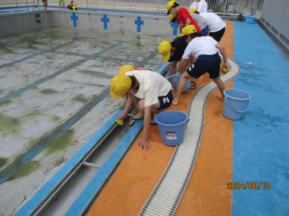 プール学習に向けて、気持ちのよいプールにするために清掃活動を行いました。一人一人が考えて一生懸命掃除に取り組んでいました。