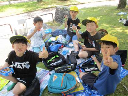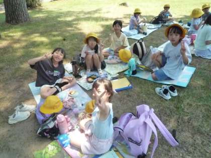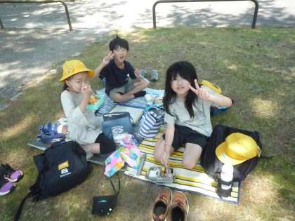 お弁当の時間です。水族館の横の公園で友達と楽しく食べています。