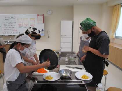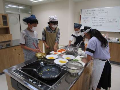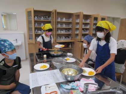 今日は1組で調理実習をしました。野菜を安全に切ったり、焦げないように炒めたりしました。朝ご飯のおかずにぴったりのメニューです。またお家でも作ってみてください。