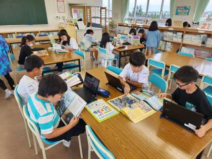 図書室の本やインターネットを使って、環境問題について調べました。たくさん調べたことの中から、今後さらに調べたいことや自分たちの課題等を見付けていきます。