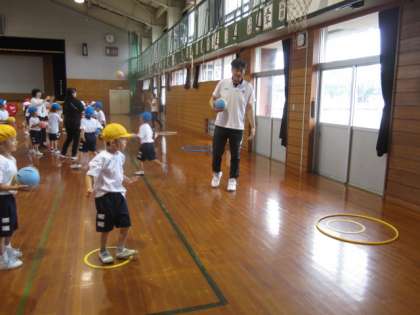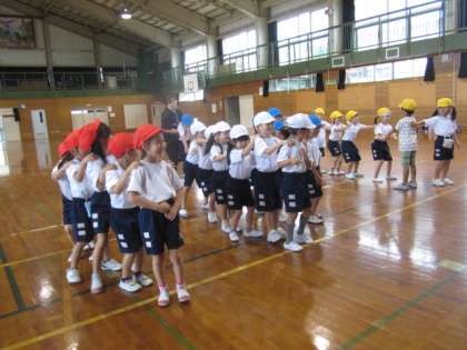 今日の体育はスポーツ派遣事業として、体育の先生が来てくださいました。先生が言った言葉と逆の言葉を言いながら動いたり、色団でつながりながら一緒に動いたりと、楽しそうに活動していました。ボール運動では、ペアと息を合わせて、ボールの受け渡しをし、リズムよく体を動かしていました。