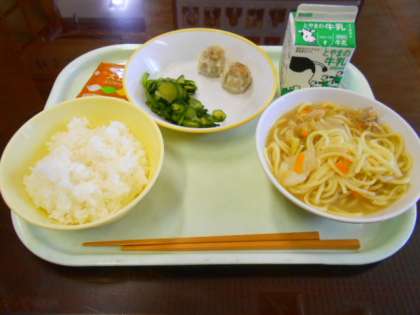 今日の給食は、ごはん、牛乳、肉シュウマイ、しょうがひたし、とんこつラーメン、大豆ふりかけです。しょうがひたしは、小松菜、きゅうりを塩、しょうゆ、みりんとしょうがで和えた、さわやかなおひたしでした。