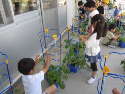 昨日、話し合った「蔓が伸びていて、友達のアサガオとからまってる!」「伸びすぎていて踏んじゃいそう」という、子供たちからの悩みを解決するために、今日はアサガオの鉢に支柱をたてました。丁寧にそっと蔓同士の絡まりをほどき、支柱にくるくる巻いていました。「蔓のチクチクが手に当たって、くすぐったい!」と、蔓の触り心地を感じている子もいました。