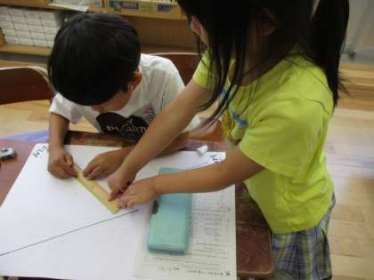 ブロック○個分では端数が出てしまい、正確に表しきれなかった長さを、cm・mmを使うことでだれもが分かる長さとして表すことができました。ランキングが出来上がり、「もう1回やりたい、次はもっととばすぞ」と意気込んでいました。遊びの中でも今日の学習を生かしてどんどん竹ものさしを使いこなし、長さの量感を身に付けていってほしいものです。