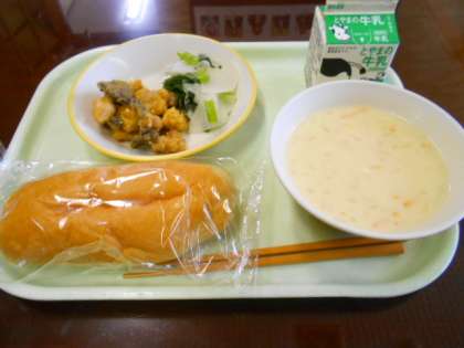 毎週金曜日は、パンが主食の日です。今日の米粉コッペパンは、とてもやわらかく、もっちりしているのが特徴です。