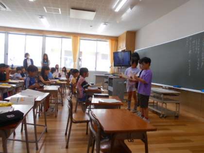 2年生は、2クラスとも国語でした。友達が出すヒントを聞き、それを手がかりに教科書の絵の中かからヒント通りの人を探す学習でした。