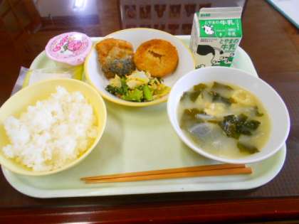今日の給食は、選択献立(セレクト給食)でした。ごはん、牛乳、具だくさん汁、いり大豆和え、魚のカレー揚げorハムチーズフライ、ももゼリーorレモンタルトでした。