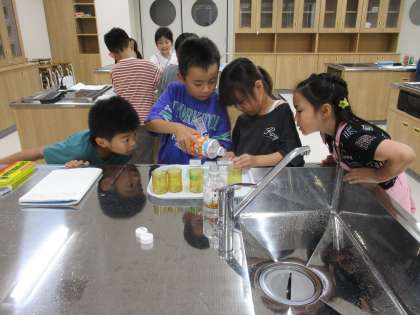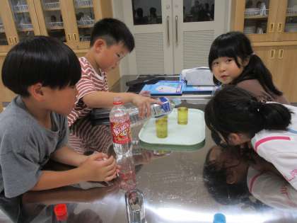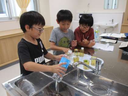いろいろな容器の水のかさを量りました。こぼさないように慎重に作業し、mLやL、dLで表しました。ラベルの表示を確認しながら、「ぴったり2dL!200mLと同じ量だね」「満タンに入っていると、ラベルの量よりたくさん入るね。」と気付いたことを話しながら、楽しく活動しました。